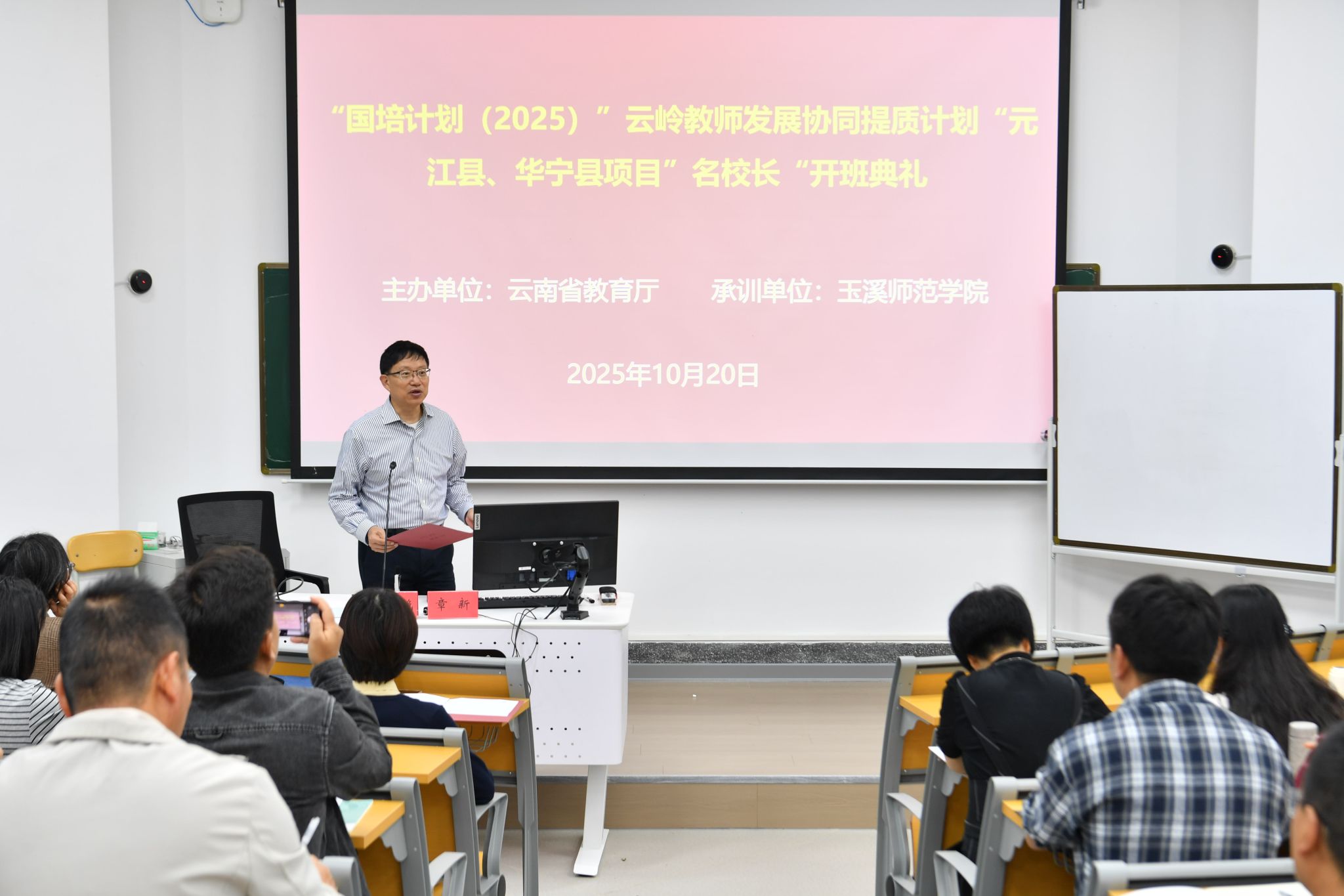 10月20日上午, “国培计划(2025)” 云岭教师发展协同提质计划项目元江县、华宁县 “名校长” 培训班开班典礼在玉溪师范学院博思馆举行。玉溪师范学院副校长章新、继续教育中心副主任杨春艳、班主任刘超、侯芳以及参训的61名校长参与典礼。