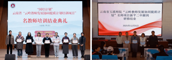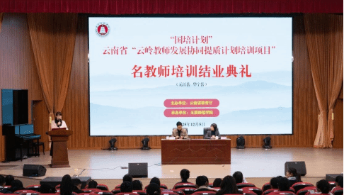 2025年12月5日下午,“国培计划(2025)云岭教师发展协同提质计划”华宁县、元江县“名师”培训班结业典礼分别在玉溪师范学院附属小学演播厅、新平二中报告厅同步举行。玉溪师范学院继续教育中心副主任杨春艳,玉溪师范学院附属小学副书记周玉松,新平二中书记杨奇、校长徐成兵、副校长高永、教务主任杨发兵等嘉宾应邀出席结业典礼。