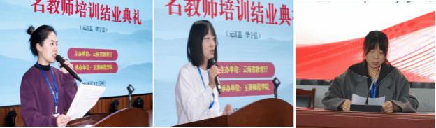 接着,学员代表们依次分享培训收获。在附属小学会场,华宁县宁州街道中心小学陆茜、元江县第一小学李梅结合一线教学管理经验,深情讲述了培训中获得的思想启发与能力提升。在新平二中会场,元江县第一中学常绍霞聚焦乡村教育实践,阐释了将前沿教育理念融入乡村课堂的思考与规划。三位学员均表示,将把培训所学的先进理念与科学方法运用到工作岗位中,为区域教育质量提升注入新活力。